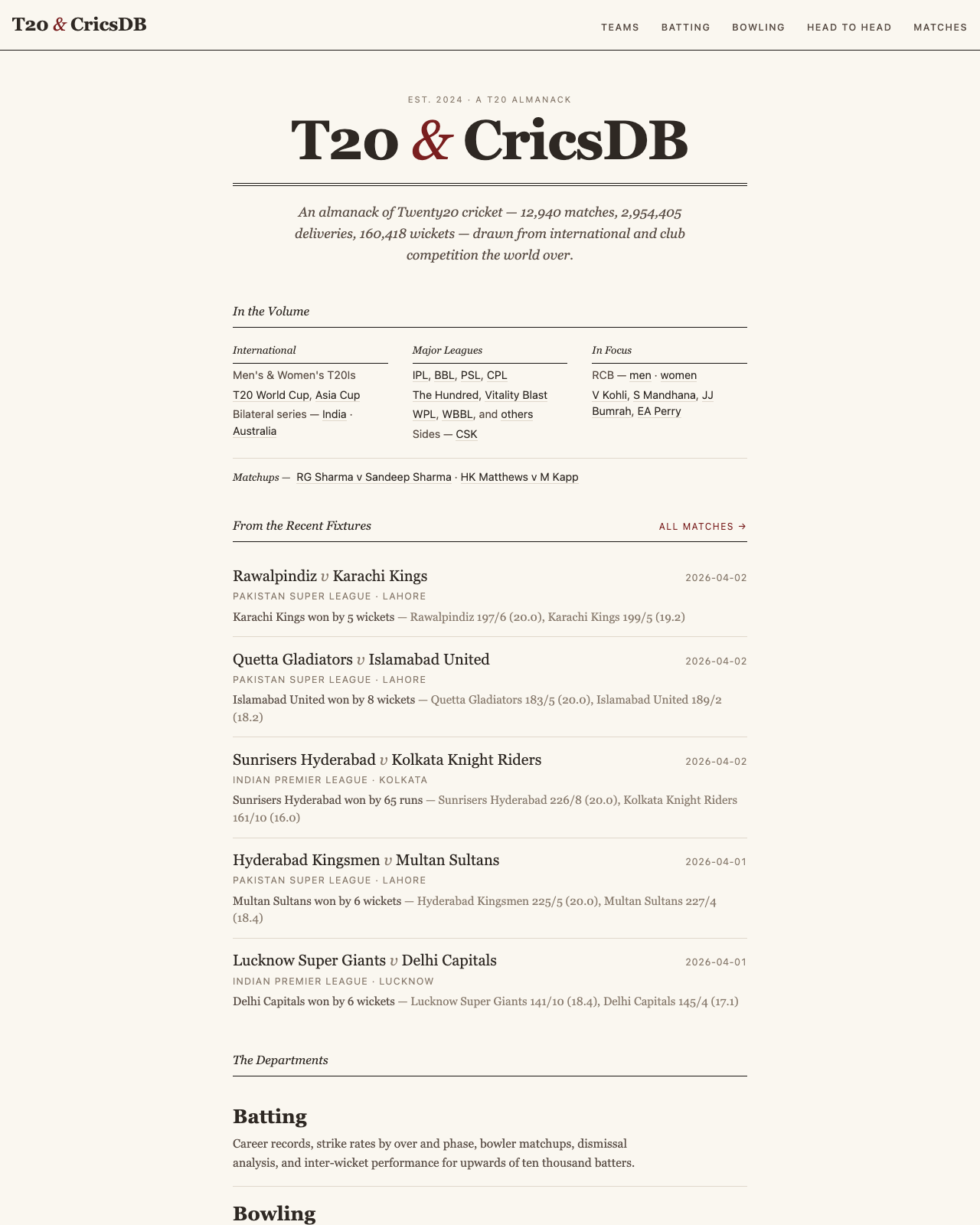A full-stack T20 cricket analytics site built on FastAPI, React, Semiotic, and SQLite — with a Wisden-almanack visual identity and ball-by-ball data from cricsheet.org.