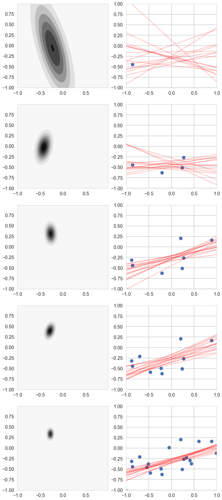 postW,mu,cov = update(np.array([1,xnew[j]]),ynew[j],likelihoodPrecision,mu,cov)