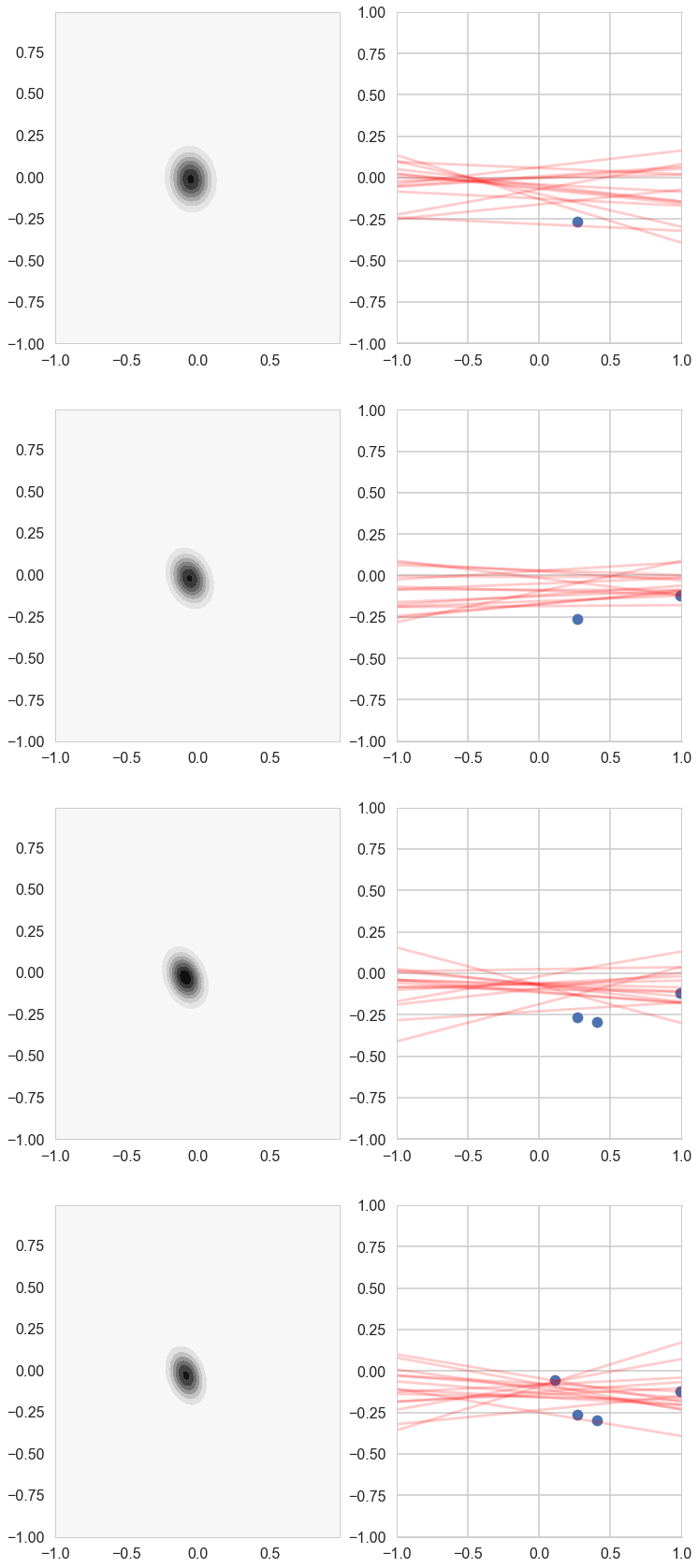plotSampleLines(muhash[i],covhash[i],15, (x[0:i],y[0:i]), axes[k][1])