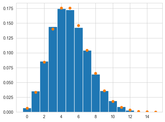 plt.plot(xxx, poisson.pmf(xxx, mu=5), 'o');