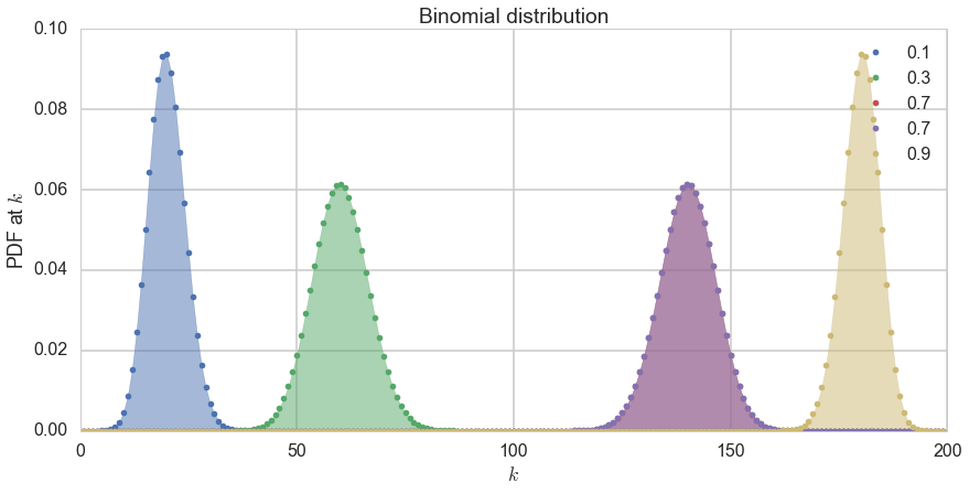 This means that we can replace the binomial distribution at large n by a gaussian where k is now a continuous variable, and whose mean is the mean of the binomial \(np\) (\(nS_n\), since the binomial distribution is on the sum, not on the average) and whose variance is \(np(1-p)\).