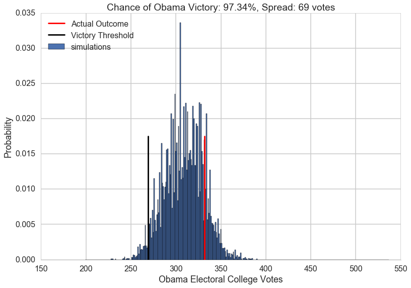 To do this, we will assume that the outcome in each state is the result of an independent coin flip whose probability of coming up Obama is given by the Predictwise state-wise win probabilities. Lets write a function simulate_election that uses this predictive model to simulate the outcome of the election given a table of probabilities.