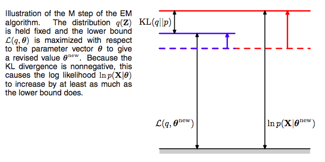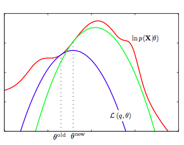 \[\ell(\theta_{t+1}) \ge \mathcal{L}(q(z,\theta_t), \theta_{t+1}) \ge \mathcal{L}(q(z,\theta_t), \theta_{t}) = \ell(\theta_t)\]