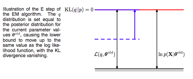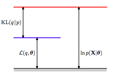 where \(\mathrm{KL}\) is the Kullback-Leibler divergence between \(q(x)\) and the hidden variable posterior distribution \(p(z \vert x,\theta)\) at the poin \(i\).