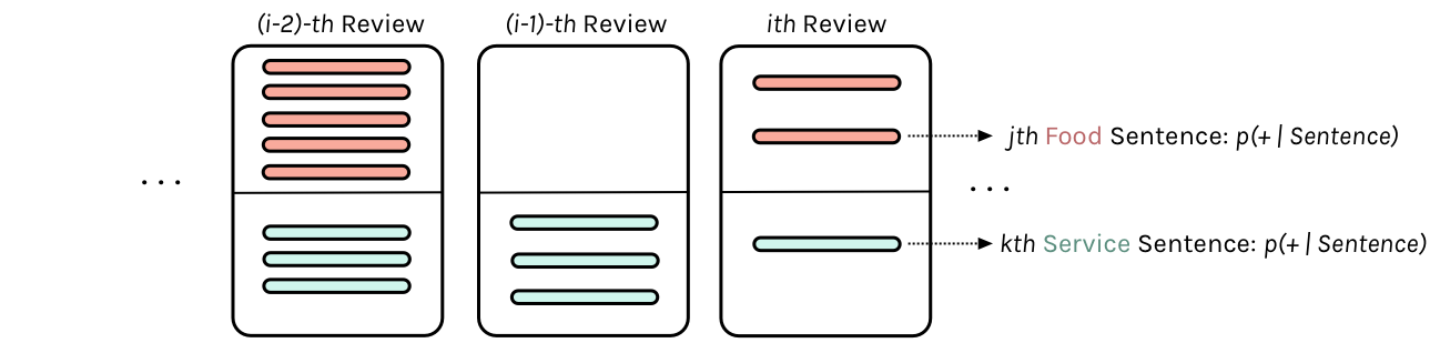Analogous hierarchical structure: restaurant reviews contain food and service sentences with per-sentence sentiment probabilities