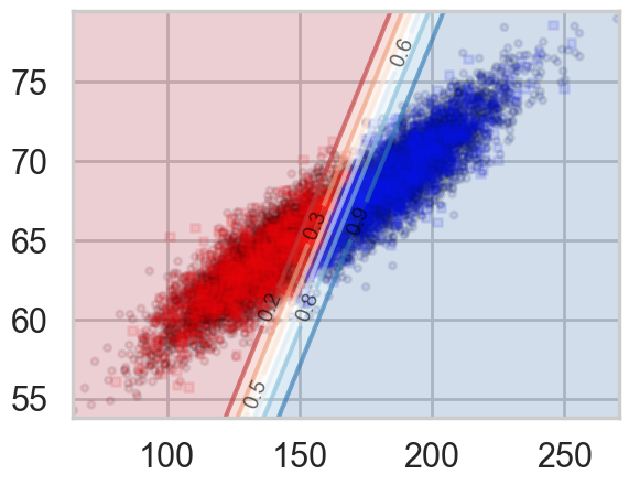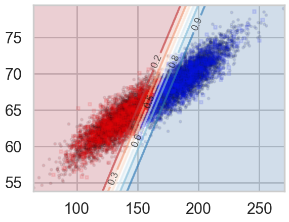 Notice that lines of equal probability, as might be expected are stright lines. What the classifier does is very intuitive: if the probability is greater than 0.5, it classifies the sample as type ‘1’ (male), otherwise it classifies the sample to be class ‘0’. Thus in the diagram above, where we have plotted predicted values rather than actual labels of samples, there is a clear demarcation at the 0.5 probability line.