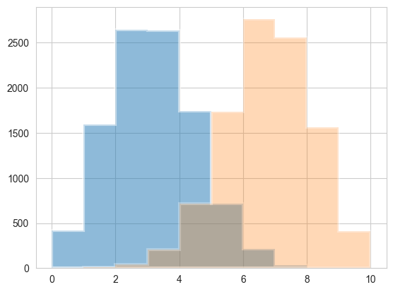 plt.hist(postpred, bins=np.arange(11), alpha=0.5, align="left", label="predictive")