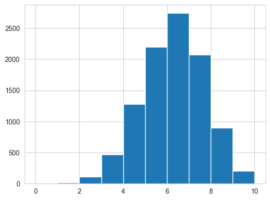 pluginpreds = np.random.binomial( len(data), mapvalue, size = len(samples))plt.hist(pluginpreds, bins=np.arange(11));