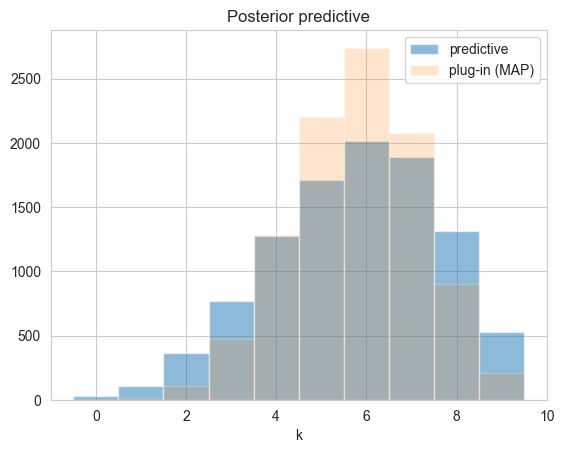 postpred = np.random.binomial( len(data), samples);postpredarray([7, 8, 8, ..., 5, 6, 8], shape=(10000,))