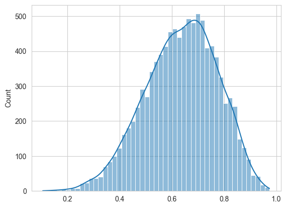 sns.histplot(grid_post_samples, kde=True)