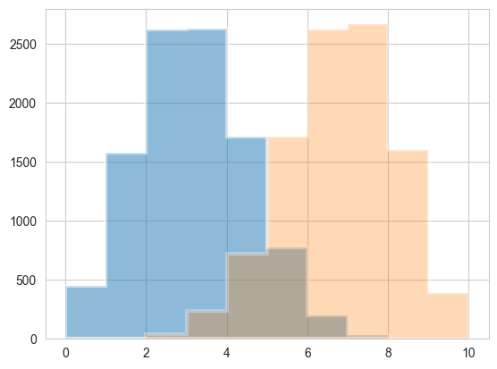 plt.hist(postpred, bins=np.arange(11), alpha=0.5, align="left", label="predictive")