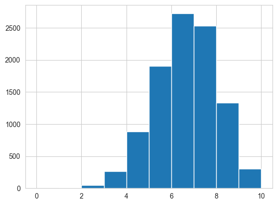 pluginpreds = np.random.binomial( len(data), mapvalue, size = len(samples))plt.hist(pluginpreds, bins=np.arange(11));