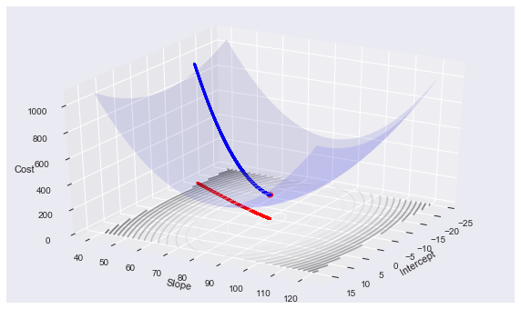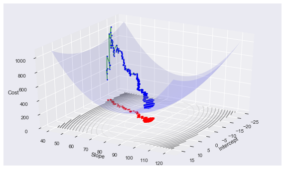make_3d_plot2(i, ST[i], theta[0], theta[1], cost2[-1], [history2[ST[i]]], [cc2[ST[i]]], np.array([x2[ST[i]]]), np.array([y2[ST[i]]]))Using Imagemagick we can produce a gif animation: (convert -delay 20 -loop 1 3danim*.png animsgd.gif)
