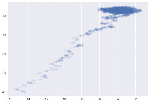 plt.plot([t[0] for t in history2], [t[1] for t in history2],'o-', alpha=0.1)