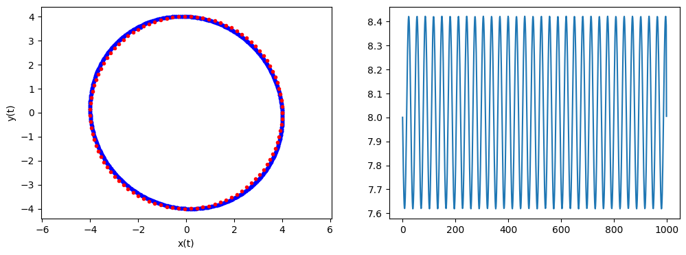 Notice that in the example above the Hamiltonian is conserved. While the \(q\) amd \(p\) have time dependencies, the \(H\) does not.