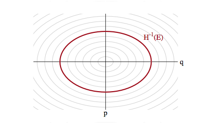 with \(E_i\) constants (constant energies) for each level-set foliate and where the potential energy \(V(q) = -log(p(q))\) replaces the energy term we had earlier in simulated annealing. The first term above is called the kinetic energy \(K(p,q)\) and has a mass parameter \(m(q)\), as you might be familiar with from introductory physics (where \(m\) is a constant. One can consider generalizations of the kinetic energy term, but with a quadratic in \(p\) and if \(V(q) = \frac{1}{2}q^2\) our distribution is gaussian and the level sets are ellipses of constant energy, as illustrated below.