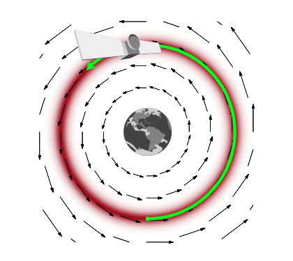 If we add just the right amount of momentum, it will exactly counterbalance the gravitational force, and the satellite will continue to move in its orbit. And this is an orbit of minimum energy (and therefore constant energy, since a system at minumum energy wont lift from it unless kicked(perhaps stochastically) to do so). Thus the satellite will move exactly along a level-curve of the energy level, in a direction exactly perpendicular to the gradient.