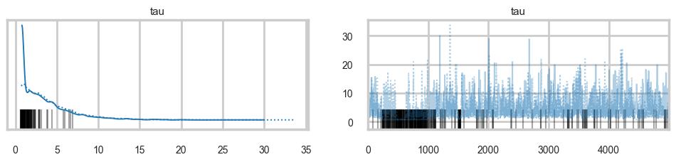 az.plot_trace(idata1, var_names=['tau'])array([[<Axes: title={'center': 'tau'}>, <Axes: title={'center': 'tau'}>]],