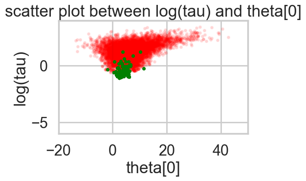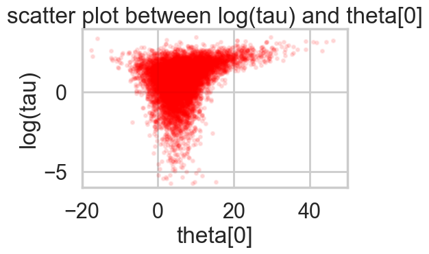 plt.title('scatter plot between log(tau) and theta[0]')