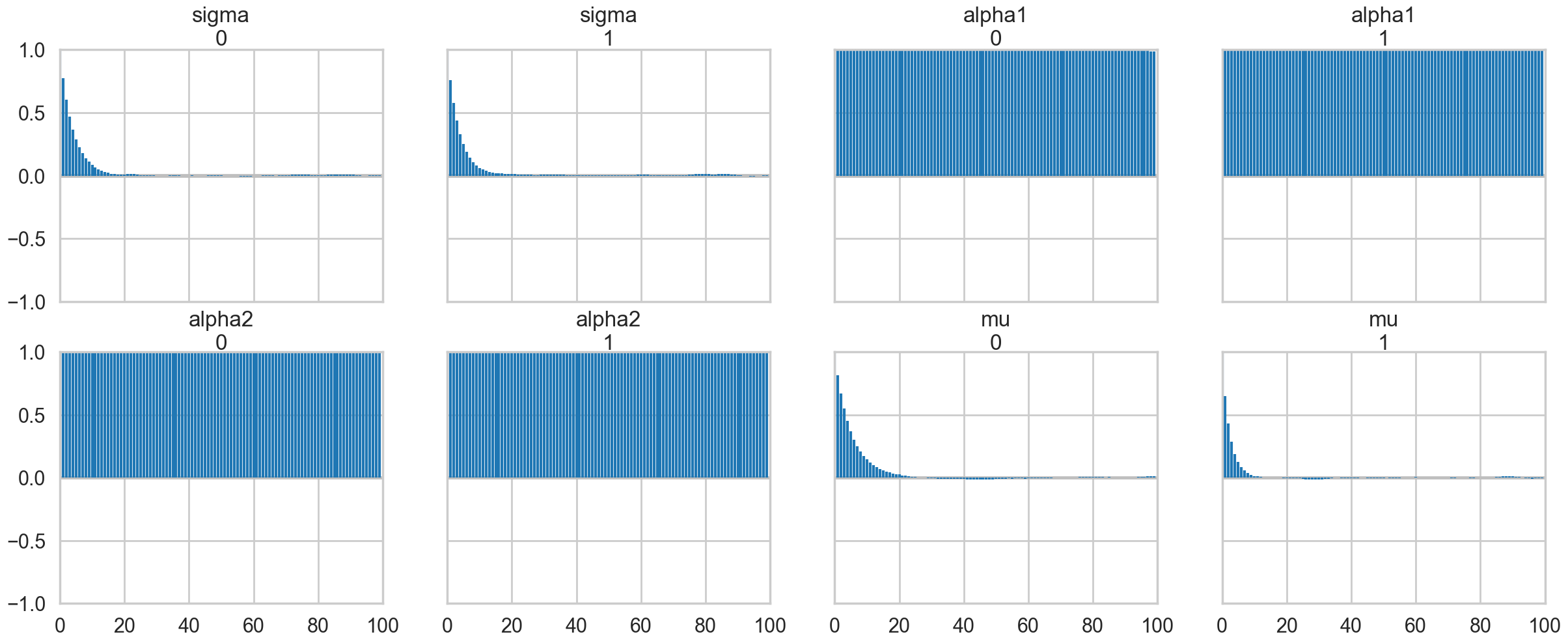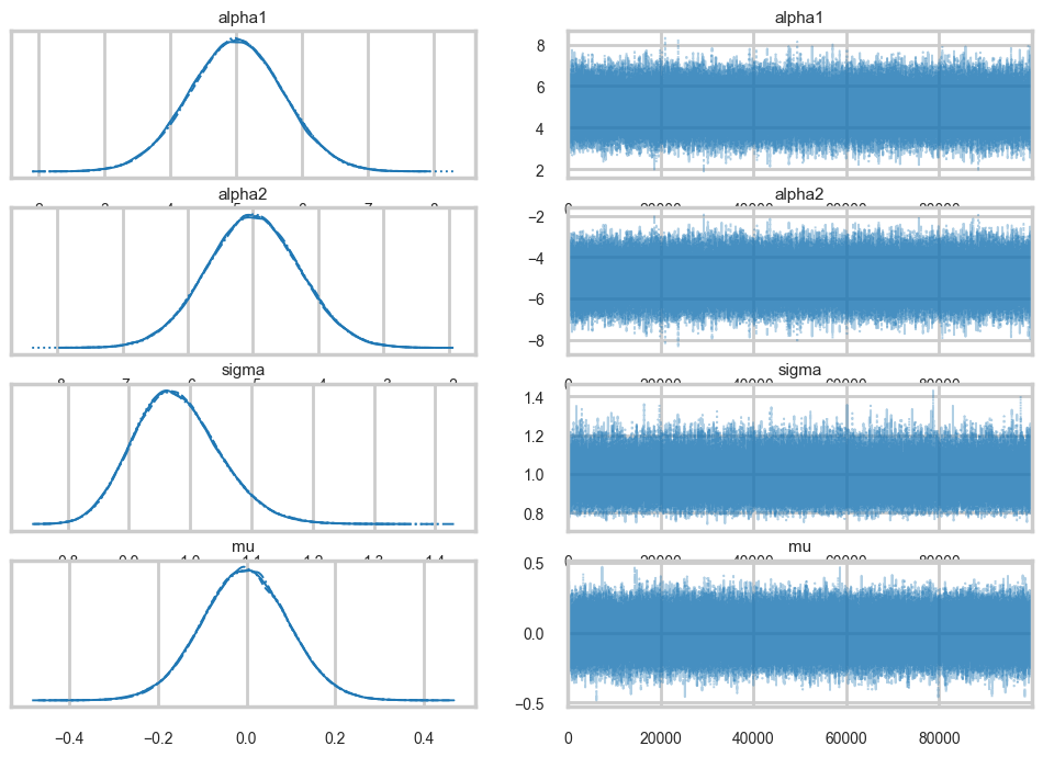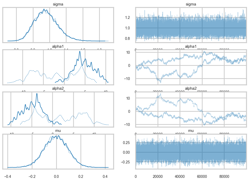 traceni2.posterior.to_dataframe().corr()| alpha1 | alpha2 | sigma | mu | |