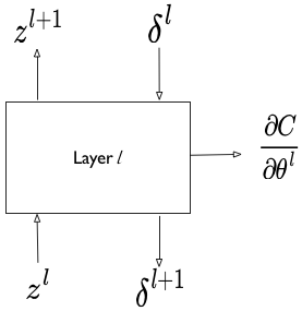 What we must specifically provide is a way to implement the 3 rules for a layer: how to get output \(z\) given input \(z\), how to get reverse output \(\delta\)s given input ones, and how to differentiate the cost with respect to any local parameters.