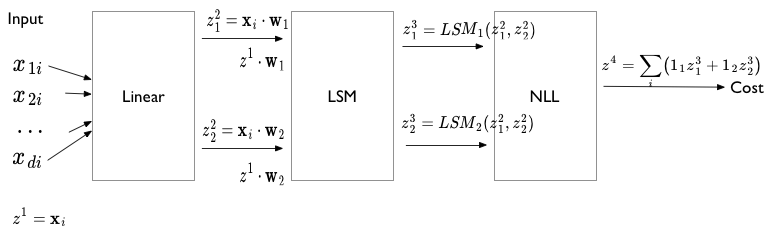 \[NLL = -\sum_i \left( \mathbb1_1(y_i) LSM_1(\v{w_1} \cdot \v{x}, \v{w_2} \cdot \v{x}) + \mathbb1_2(y_i) LSM_2(\v{w_1} \cdot \v{x}, \v{w_2} \cdot \v{x}) \right)\]
