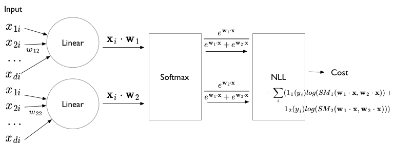 \[NLL = -\sum_i \left( \mathbb1_1(y_i) log(SM_1(\v{w_1} \cdot \v{x}, \v{w_2} \cdot \v{x})) + \mathbb1_2(y_i) log(SM_2(\v{w_1} \cdot \v{x}, \v{w_2} \cdot \v{x})) \right)\]