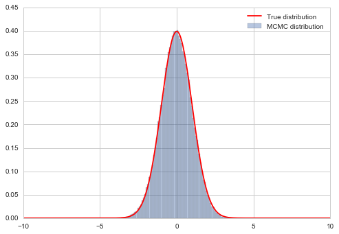 # plot our sample histogramplt.hist(samps,bins=80, alpha=0.4, label=u'MCMC distribution', normed=True) #plot the true functionxx= np.linspace(0,1,100)plt.plot(xxx, norm.pdf(xxx), 'r', label=u'True distribution') plt.legend()plt.show()print("starting point was ", 0.0)