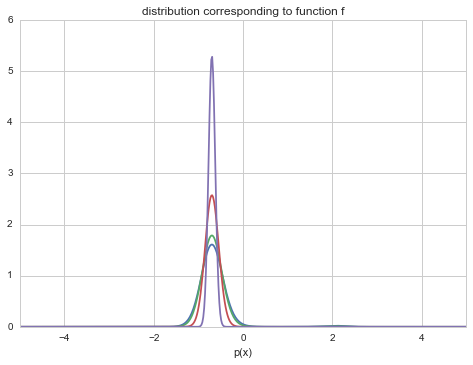 and so you get a peakier and peakier distribution as \(T \to 0\) around the global minimum (the globality and the exponentiation ensures that this peak is favored over the rest in the dfunction \(f\)). You can see this in the diagram below. As \(T \to 0\), we get towards a delta function at the optimum and get a global minimum instead of a distribution.