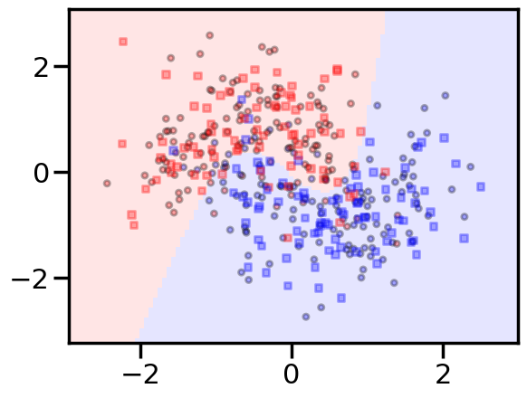 logistic.plot_boundary(X_train, X_test, y_train, y_test)
