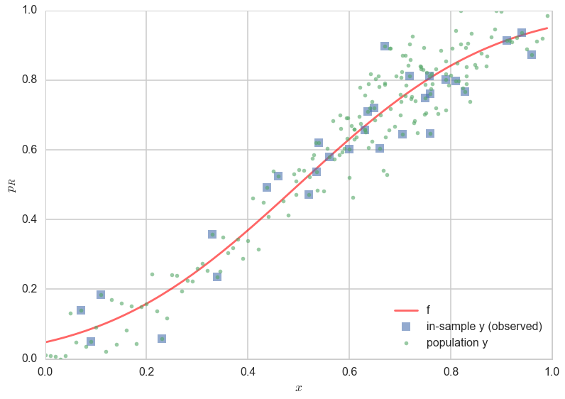 In the figure above, one can see the scatter of the \(y\) population about the curve of \(f\). The errors of the 30 observation points (“in-sample”) are shown as squares. One can see that observations next to each other can now be fairly different, as we descibed above.