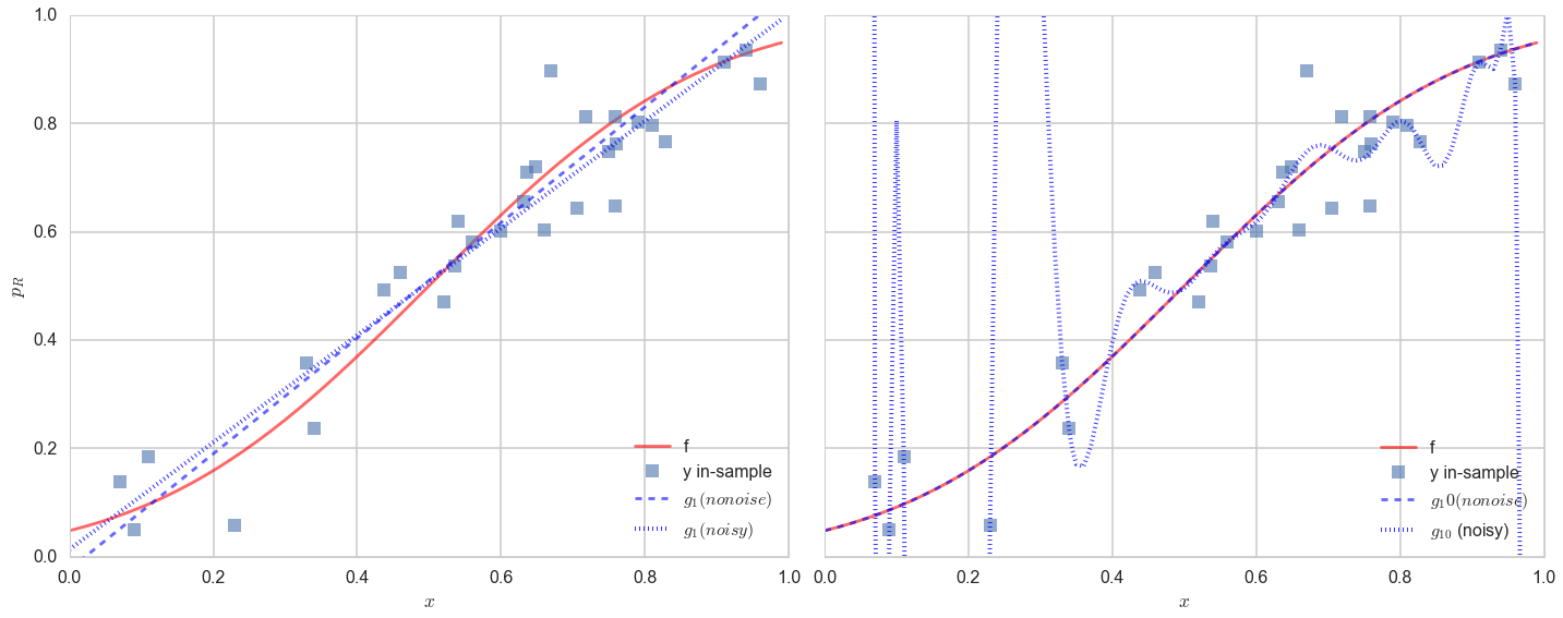 - You learned the effect of noise on this fit, and the issues that crop up in learning target functions from data, chiefly the problem of overfitting to this noise.