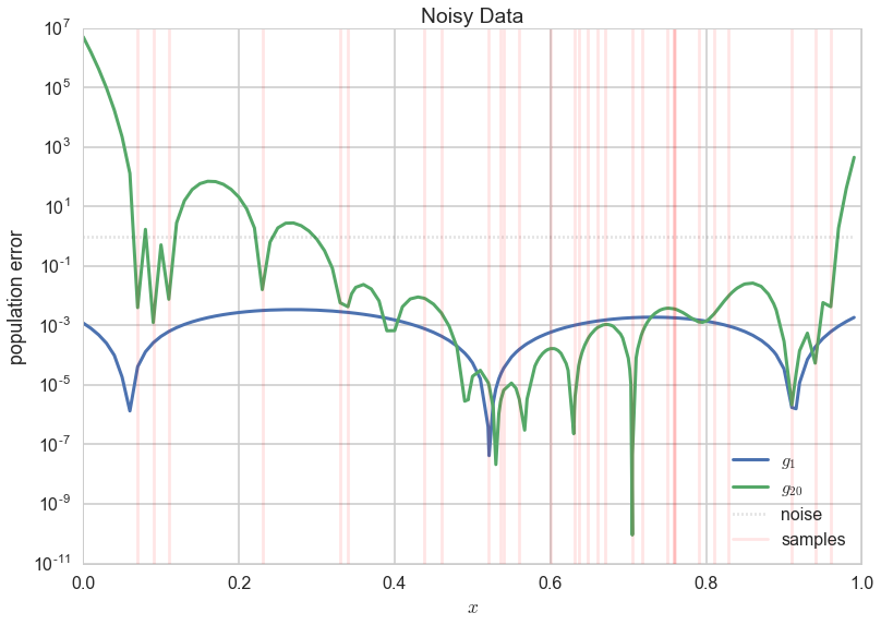 \(g_1\) now, for the most part, has a lower error! So you’d be better off by having chosen a set of models with much more bias (the straight lines, \(\cal{H}_1\)) than a more complex model set (\(\cal{H}_{20}\)) in the case of noisy data.