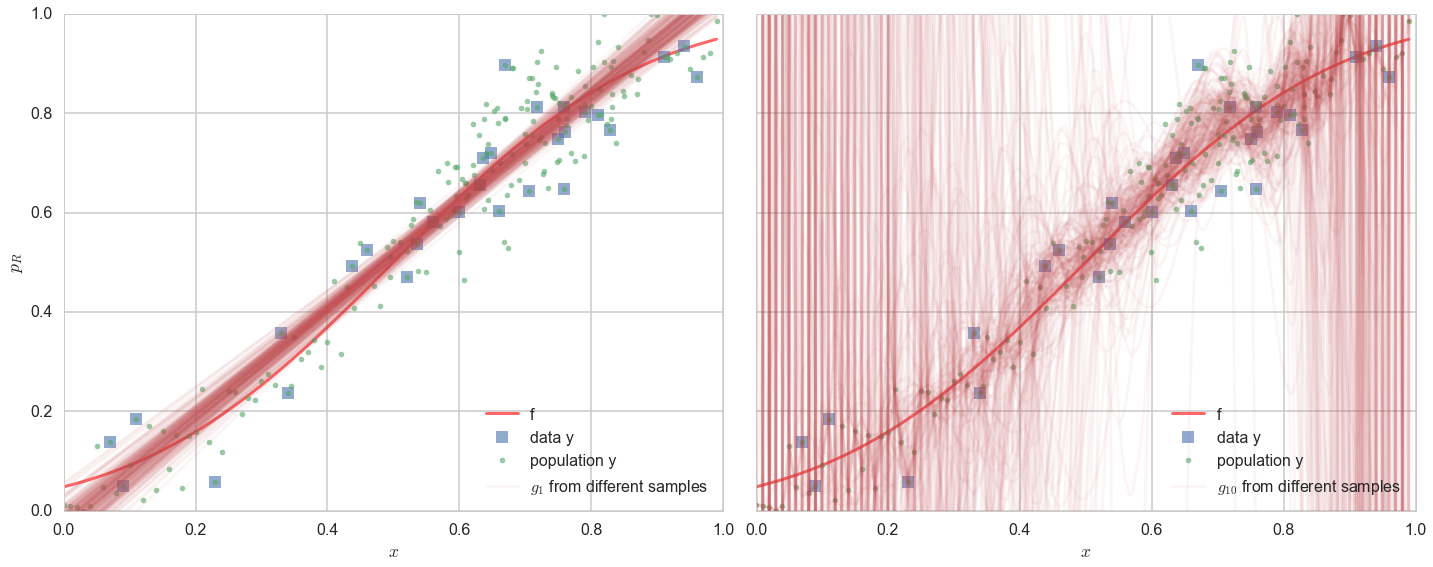 On the right panel, we see the same with best-fit models chosen from \(\cal{H}_{20}\). It is a diaster. While most of the models still band around the central trend of the real curve \(f\) and data \(y\) (and you still see the waves corresponding to all too wiggly 20th order polynomials), a substantial amount of models veer off into all kinds of noisy hair all over the plot. This is variance: the the predictions at any given \(x\) are all over the place.