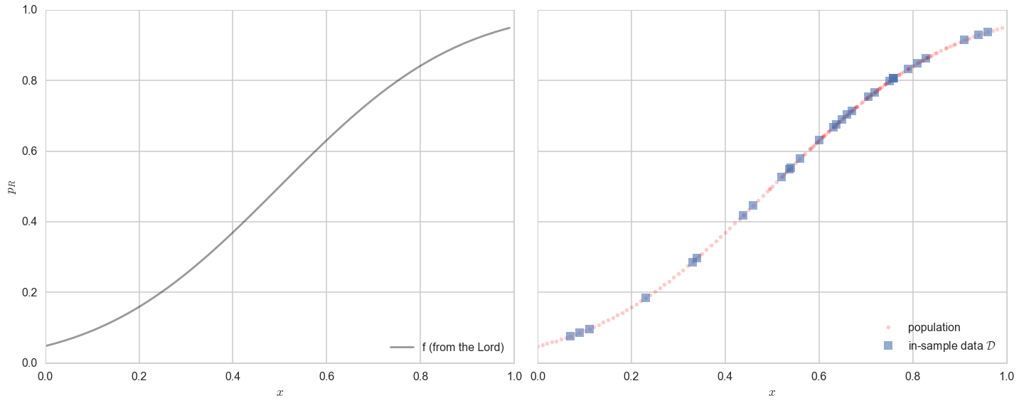 Now, in real life we are only given a sample of points. Lets assume that out of this population of 200 points we are given a sample \(\cal{D}\) of 30 data points. Such data is called in-sample data. Contrastingly, the entire population of data points is also called out-of-sample data.