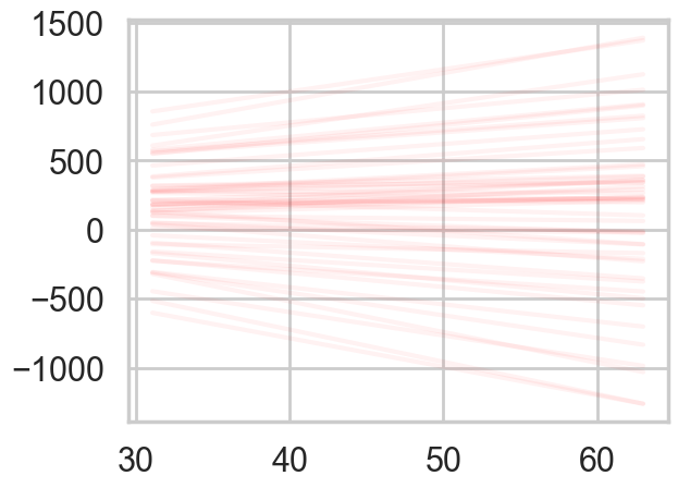 However, by including the \(\mu\) as a deterministic in our traces we only get to see the traces at existing data points. If we want the traces on a grid of weights, we’ll have to explivitly plug in the intercept and slope traces in the regression formula