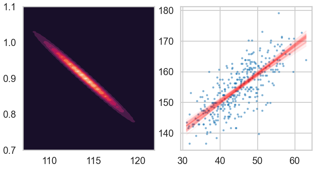 plotSampleLines(mu, cov,50, (df2.weight.values,df2.height.values), axes[1])