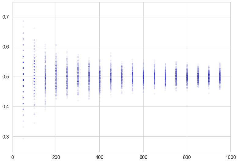 for i in sample_sizes:if i %50==0and i <1000: plt.scatter([i]*200, sample_means[i], alpha=0.05);plt.xlim([0,1000])plt.ylim([0.25,0.75]);