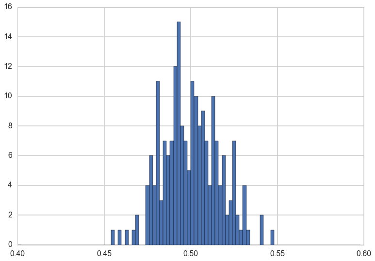 Since, in the real world, we see only one sample, this distribution helps us do inference, or figure the uncertainty of the estimates of quantities we are interested in. If we can somehow cook up samples just somewhat different from the one we were given, we can calculate quantities of interest, such as the mean on each one of these samples. By seeing how these means vary from one sample to the other, we can say how typical the mean in the sample we were given is, and whats the uncertainty range of this quantity. This is why the mean of the sample means is an interesting quantity; it characterizes the sampling distribution of the mean, or the distribution of sample means.