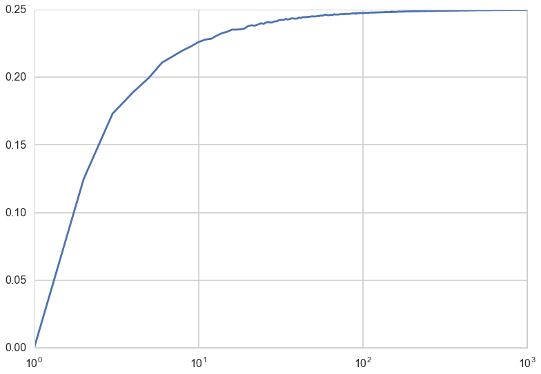 def make_throws_var(number_of_samples, sample_size): start=np.zeros((number_of_samples, sample_size), dtype=int)for i inrange(number_of_samples): start[i,:]=throw_a_coin(sample_size)return np.var(start, axis=1)sample_vars_1000_replicates = [make_throws_var(number_of_samples=1000, sample_size=i) for i in sample_sizes]mean_of_sample_vars_1000 = [np.mean(vars) forvarsin sample_vars_1000_replicates]plt.plot(sample_sizes, mean_of_sample_vars_1000);plt.xscale("log");
