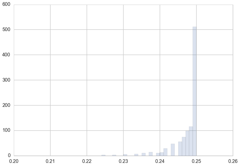An interesting application of this idea, as Shalizi points out in http://www.stat.cmu.edu/~cshalizi/ADAfaEPoV/, is that the loss of variability due to sampling of genes is indeed the origin of genetic drift. More prosaically, the fact that the above graph of expected sample variance against sample size asymptotes to 0.25 is as \(\frac{N-1}{N}\) if very close to 1 at large N.