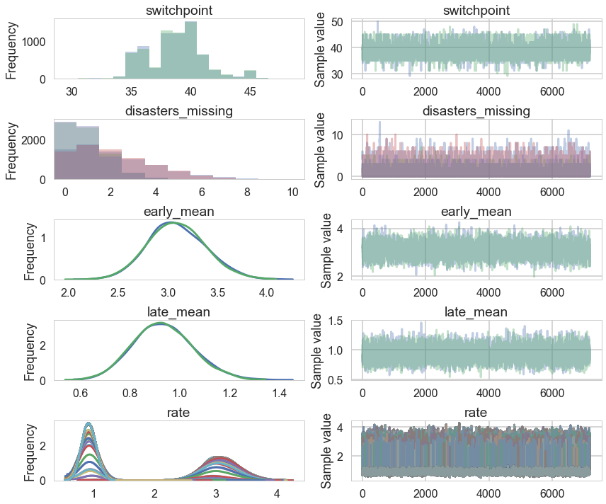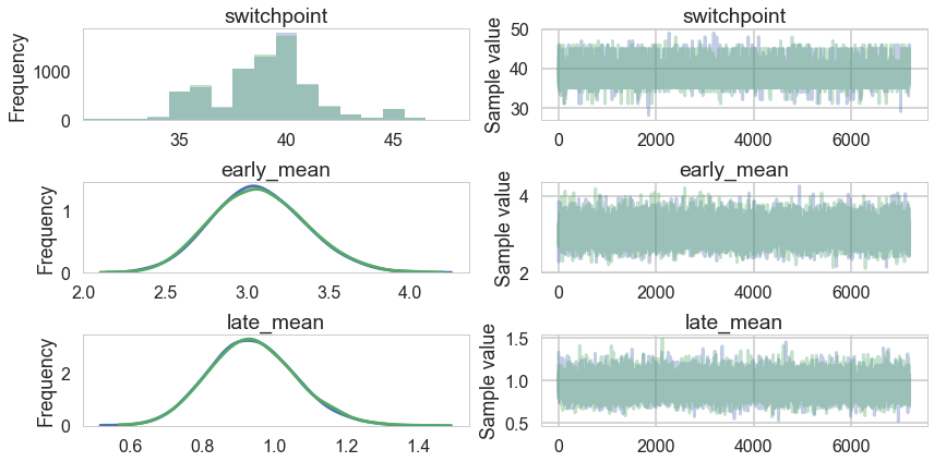 type(switchpoint), type(early_mean)(pymc3.model.FreeRV, pymc3.model.TransformedRV)