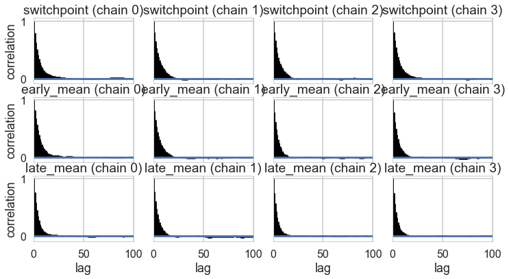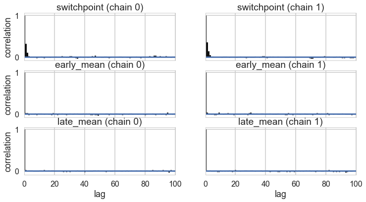 pm.trace_to_dataframe(t2).corr()| switchpoint | early_mean | late_mean | |