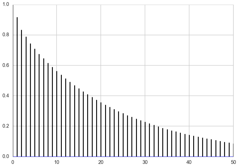 To figure out exactly how many samples we would have to draw, we can compute effective sample size, a measure of how many independent samples our our samples are equivalent to. This usese the same quantities that were used to compute the autocorrelation plot above. The following code is taken from https://code.google.com/p/biopy/source/browse/trunk/biopy/bayesianStats.py?r=67. You don’t need to try to understand the function – it’s just here to run it, and this is a rather slow implementation.