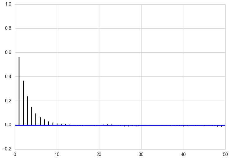 To see how effective the samples we have drawn will be at approximating summaries of the posterior distribution (for example the posterior mean), we can look at the autocorrelation of the samples. High autocorrelation would mean that the sample average that we take to approximate the posterior mean would be higher than expected if we had taken independent samples from the posterior distribution.