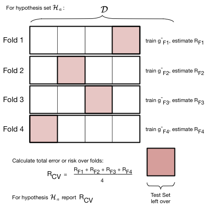 For each fold, after training the model, we calculate the risk or error on the remaining one validation part. We then add the validation errors together from the different folds, and divide by the number of folds to calculate an average error. Note again that this average error is an average over different models \(g^-_{Fi}\). We use this error as the validation error for \(d=a\) in the validation process described earlier.