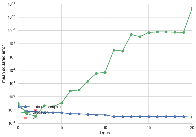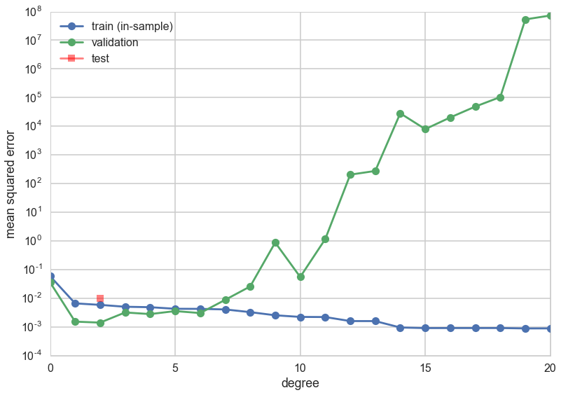 #we split the training set down furtherintrain,invalid = train_test_split(itrain,train_size=18, test_size=6)xntrain= df.x[intrain].valuesfntrain = df.f[intrain].valuesyntrain = df.y[intrain].valuesxnvalid= df.x[invalid].valuesfnvalid = df.f[invalid].valuesynvalid = df.y[invalid].valuesdegrees=range(21)error_train=np.empty(len(degrees))error_valid=np.empty(len(degrees))trainvalidlists=make_features(xntrain, xnvalid, degrees)#we now train on the smaller training setfor d in degrees:#for increasing polynomial degrees 0,1,2...#Create polynomials from x Xntrain = trainvalidlists[d]['train'] Xnvalid = trainvalidlists[d]['test']#fit a model linear in polynomial coefficients on the new smaller training set est = LinearRegression() est.fit(Xntrain, yntrain)#predict on new training and validation sets and calculate mean squared error error_train[d] = mean_squared_error(yntrain, est.predict(Xntrain)) error_valid[d] = mean_squared_error(ynvalid, est.predict(Xnvalid))#calculate the degree at which validation error is minimizedmindeg = np.argmin(error_valid)#need to remake polynomial features on the whole training setttlist=make_features(xtrain, xtest, degrees)features_at_mindeg = ttlist[mindeg]['train']test_features_at_mindeg = ttlist[mindeg]['test']#fit on whole training set now. Put MSE in variable err.#your code hereclf = LinearRegression()clf.fit(features_at_mindeg, ytrain) # fit#predict on the test set now and calculate errorpred = clf.predict(test_features_at_mindeg)err = mean_squared_error(ytest, pred)