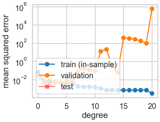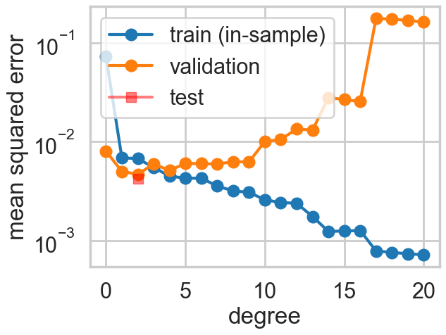 Our process used the training set to fit for the parameters(values of the coefficients) of the polynomial of given degree \(d\) based on minimizing the traing set error (empirical risk minimization). We then calculated the error on the test set at that \(d\). If we go further and choose the best \(d\) based on minimizing the test set error, we have then “fit for” \(d\) on the test set. We will thus call \(d\) a hyperparameter of the model.