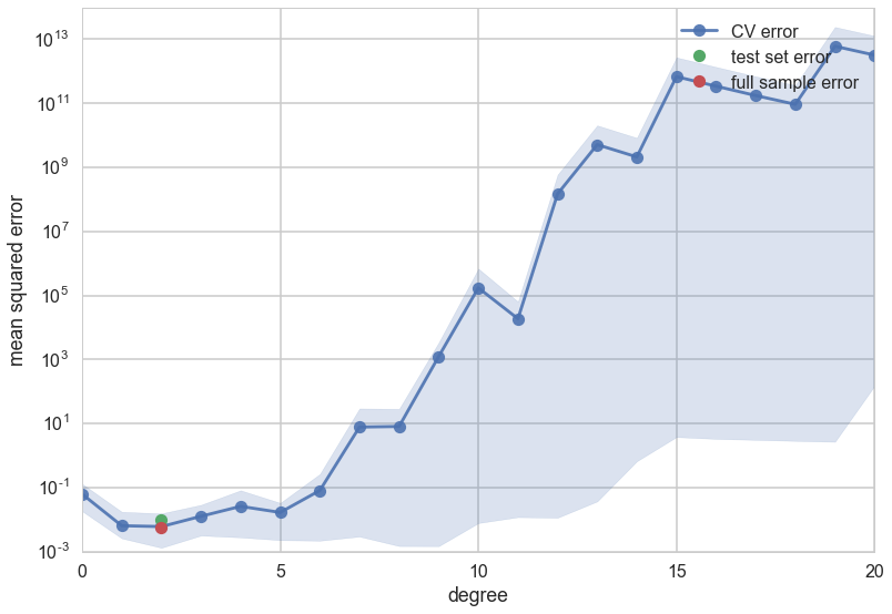 mindeg = np.argmin([r[0] for r in results])ttlist=make_features(xtrain, xtest, degrees)#fit on whole training set now.clf = LinearRegression()clf.fit(ttlist[mindeg]['train'], ytrain) # fitpred = clf.predict(ttlist[mindeg]['test'])err = mean_squared_error(pred, ytest)errtr=mean_squared_error(ytrain, clf.predict(ttlist[mindeg]['train']))errout=0.8*errtr+0.2*errc0=sns.color_palette()[0]c1=sns.color_palette()[1]#plt.errorbar(degrees, [r[0] for r in results], yerr=[r[1] for r in results], marker='o', label='CV error', alpha=0.5)plt.plot(degrees, [r[0] for r in results], marker='o', label='CV error', alpha=0.9)plt.fill_between(degrees, [r[1] for r in results], [r[2] for r in results], color=c0, alpha=0.2)plt.plot([mindeg], [err], 'o', label='test set error')plt.plot([mindeg], [errout], 'o', label='full sample error')plt.ylabel('mean squared error')plt.xlabel('degree')plt.legend(loc='upper right')plt.yscale("log")