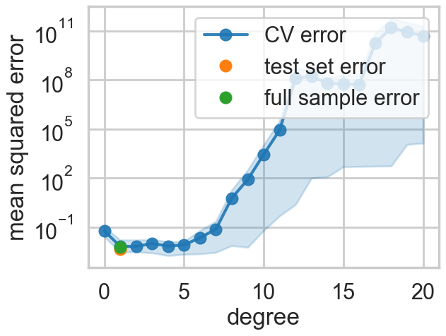 We see that the cross-validation error minimizes at a low degree, and then increases. Because we have so few data points the spread in fold errors increases as well.